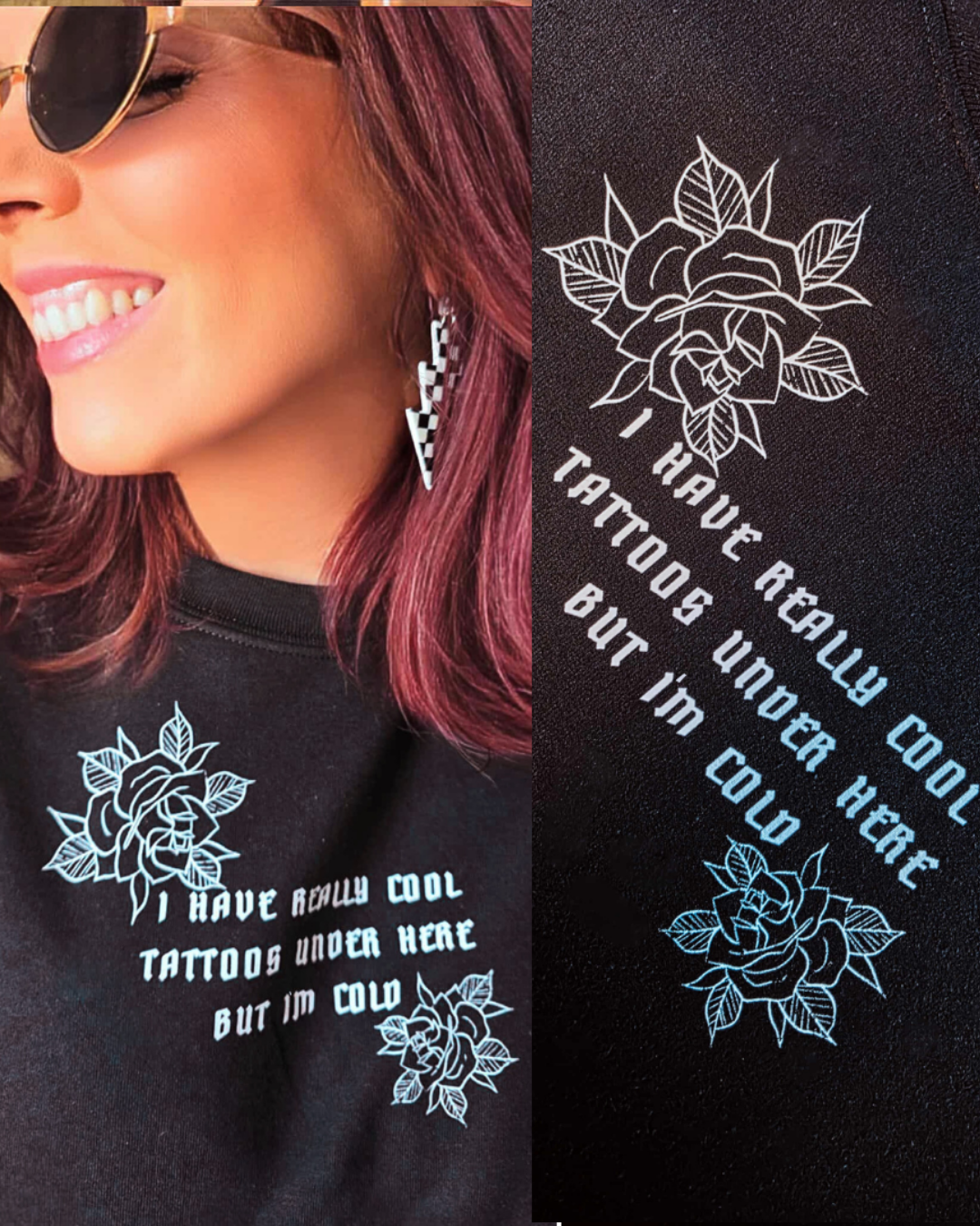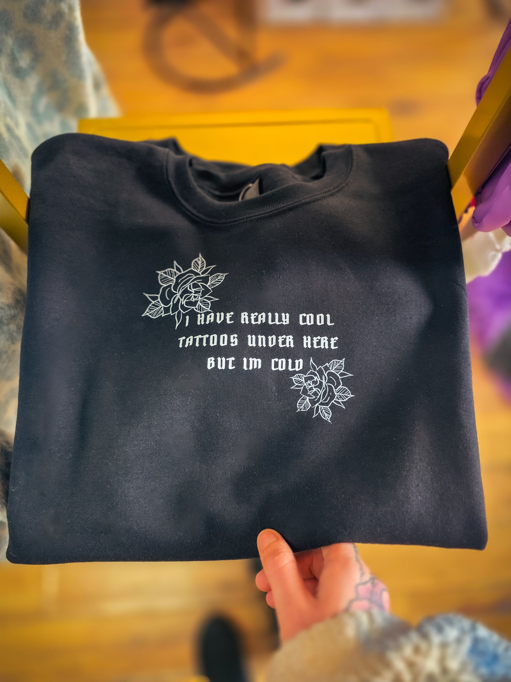 Cozy meets attitude, this black sweatshirt says "I have really cool tattoos under here but Iβm cold" in bold white lettering. Perfect for tattoo lovers who want to stay warm without hiding their edge. Soft, comfy, and guaranteed to get a laugh every time you wear it!