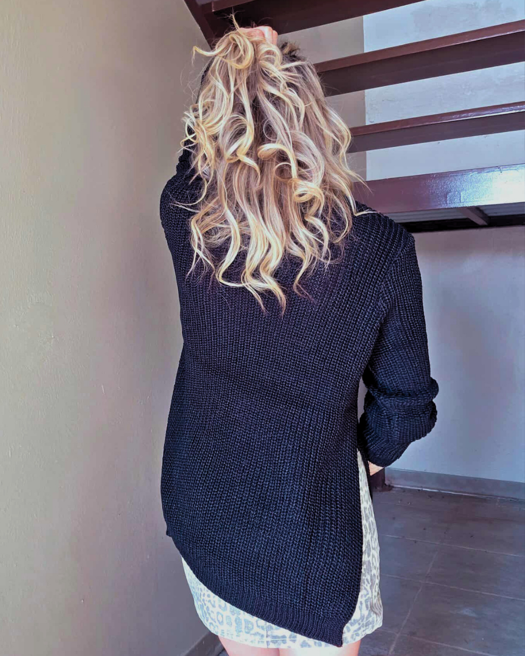 Effortless and edgy, this lightweight black knit top is a wardrobe staple with a modern twist. Designed with a built-in choker neckline, sleek long sleeves, high low cut and subtle side splits, it balances chic style with everyday comfort. The slightly oversized soft knit fabric gives it just the right amount of stretch, making it as flattering as it is versatile. Pair it with jeans and boots for a laid-back look or dress it up with faux leather leggings for a night out.